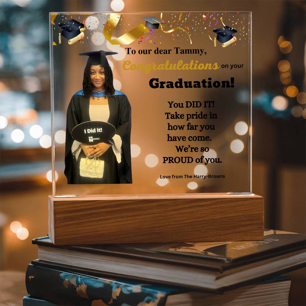 Your plaque will be crafted from premium acrylic with a professionally printed design for a polished look. It comes with a stylish wooden LED base, and you can choose between a USB plug-in option OR a cordless battery-operated option (requires 2 AAA batteries, not included). Both LED bases feature 7 vibrant colors, allowing the user to customize the lighting with various color changes and dynamic cycles.